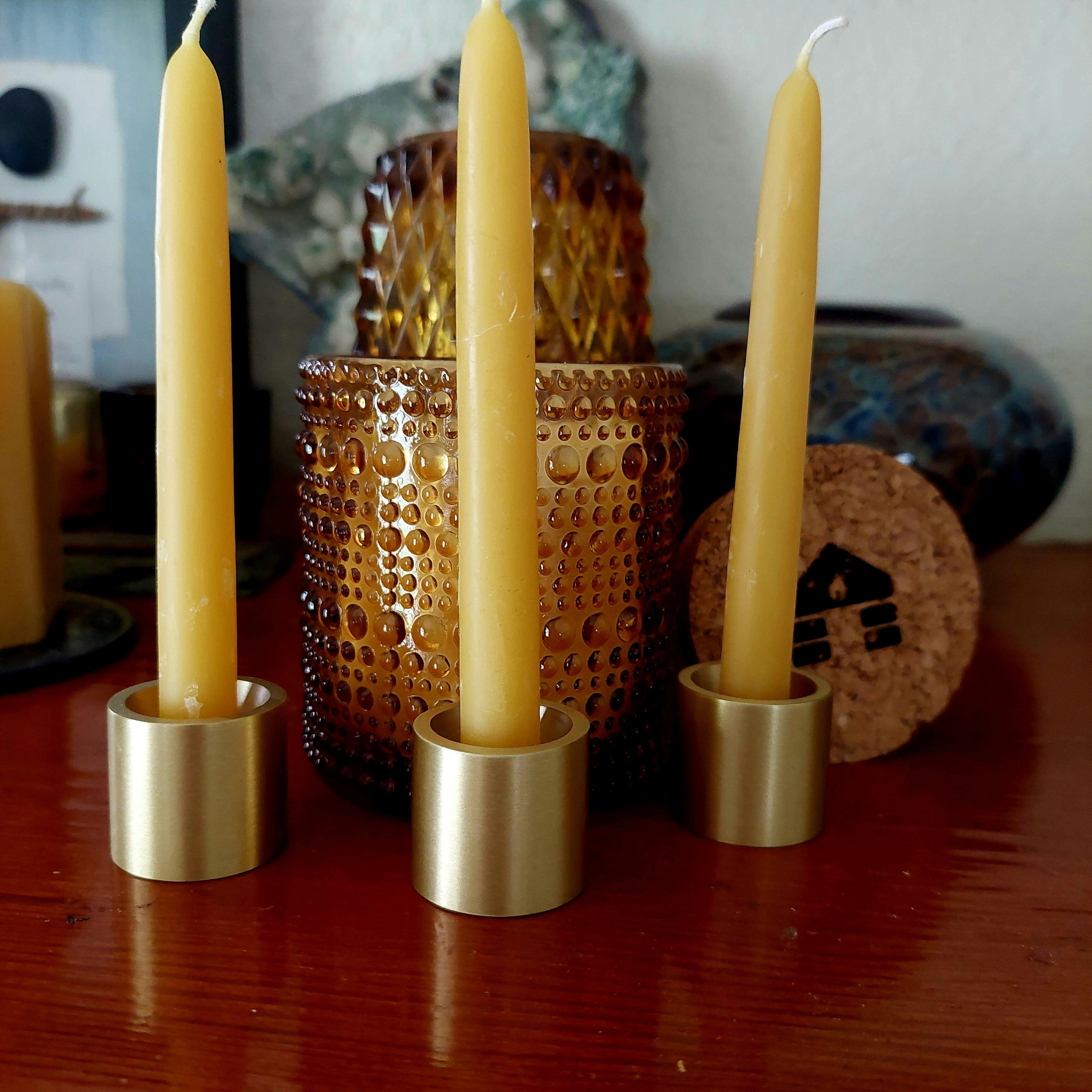 Mighty yet minimal, we custom-engineered these solid brass taper holders to house our Ceremony and Thin Beeswax Taper Candles, but with their interior funnel shape, they're also a great fit for any kind of ultra-thin taper or chime candle. Simply twist your candle into place and enjoy!