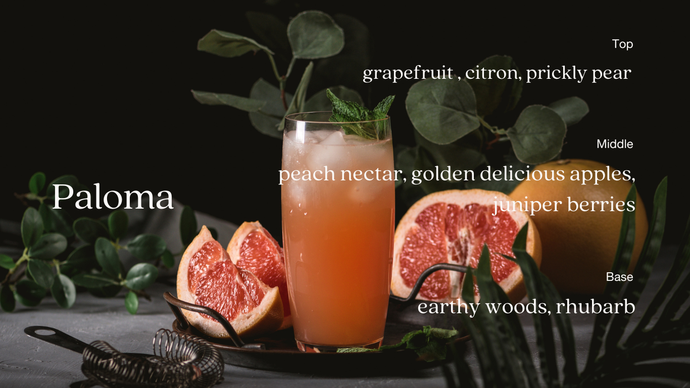 Spark some celebration with Paloma, our newest grapefruit scented candle. This enlivening fragrance opens with a burst of tangy grapefruit and zesty citron, balanced by the sweetness of succulent prickly pear. As it burns, the scent evolves with lush layers of peach nectar, golden delicious apples and juniper berries. Finally, crisp rhubarb leaves and earthy woods add elegance and depth.