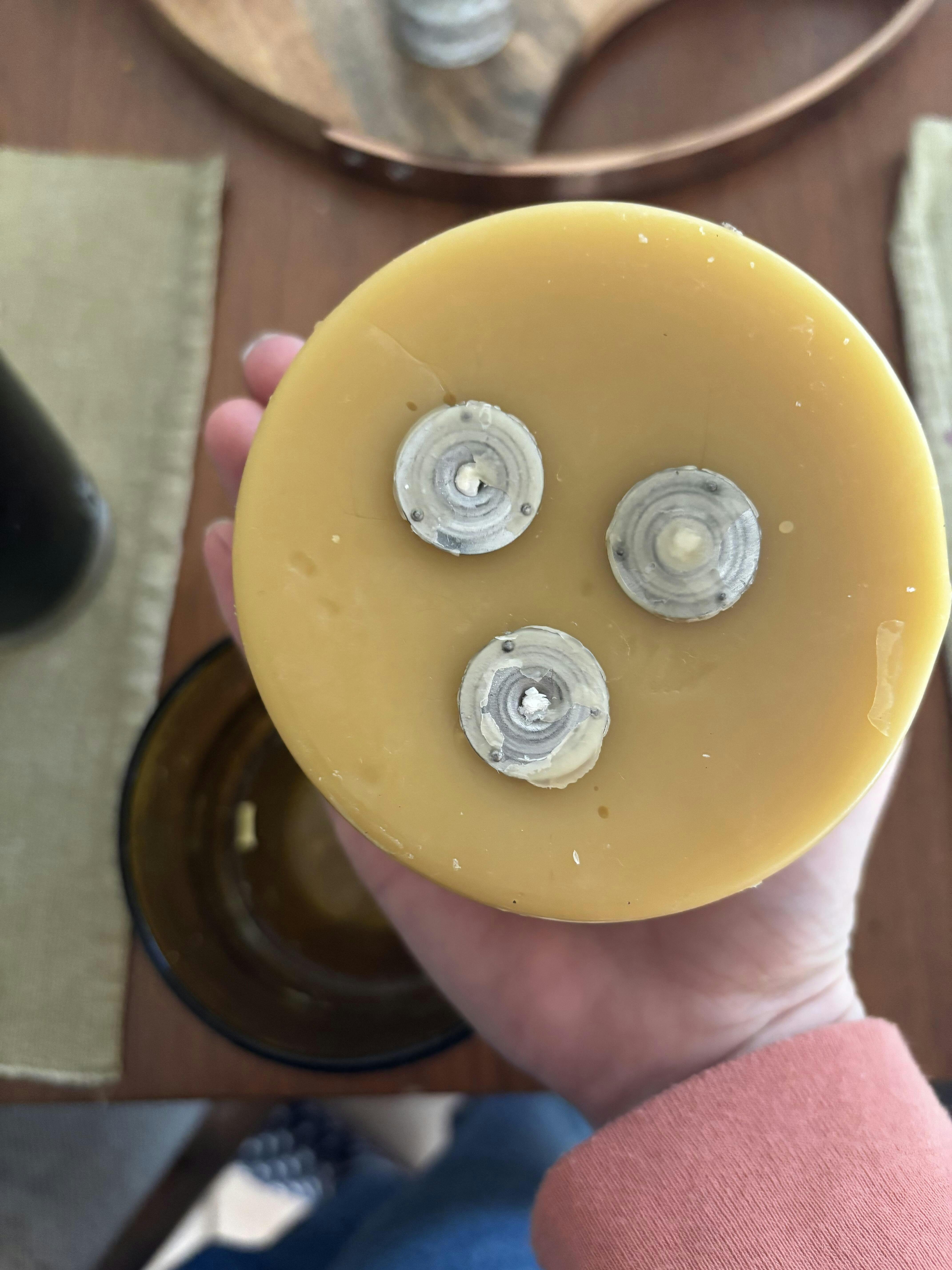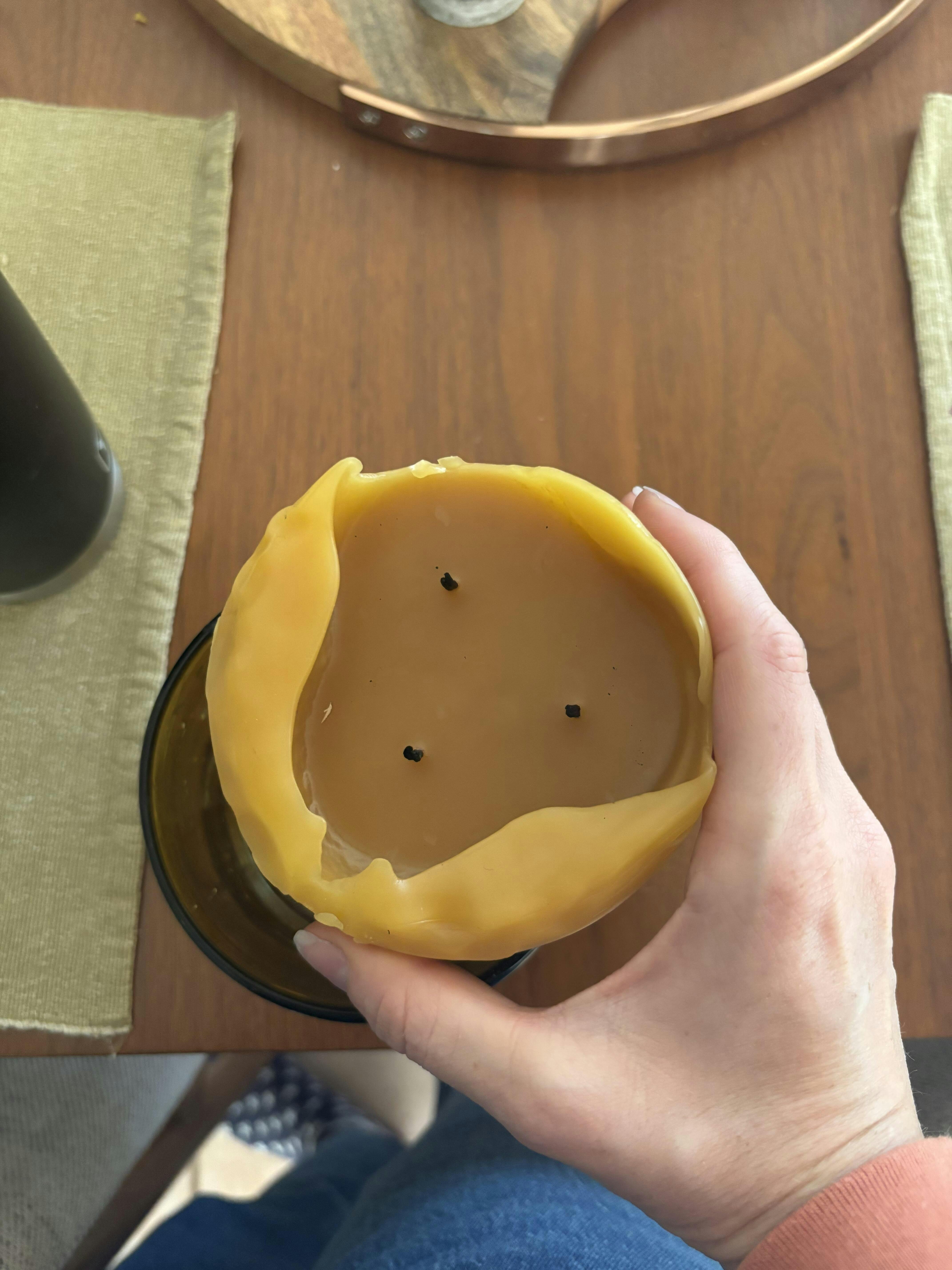 I love my refillable 3-wick candle. The wax burns beautifully and has a wonderful subtly sweet beeswax smell. The color of the glass makes the light from the candle extra cozy.