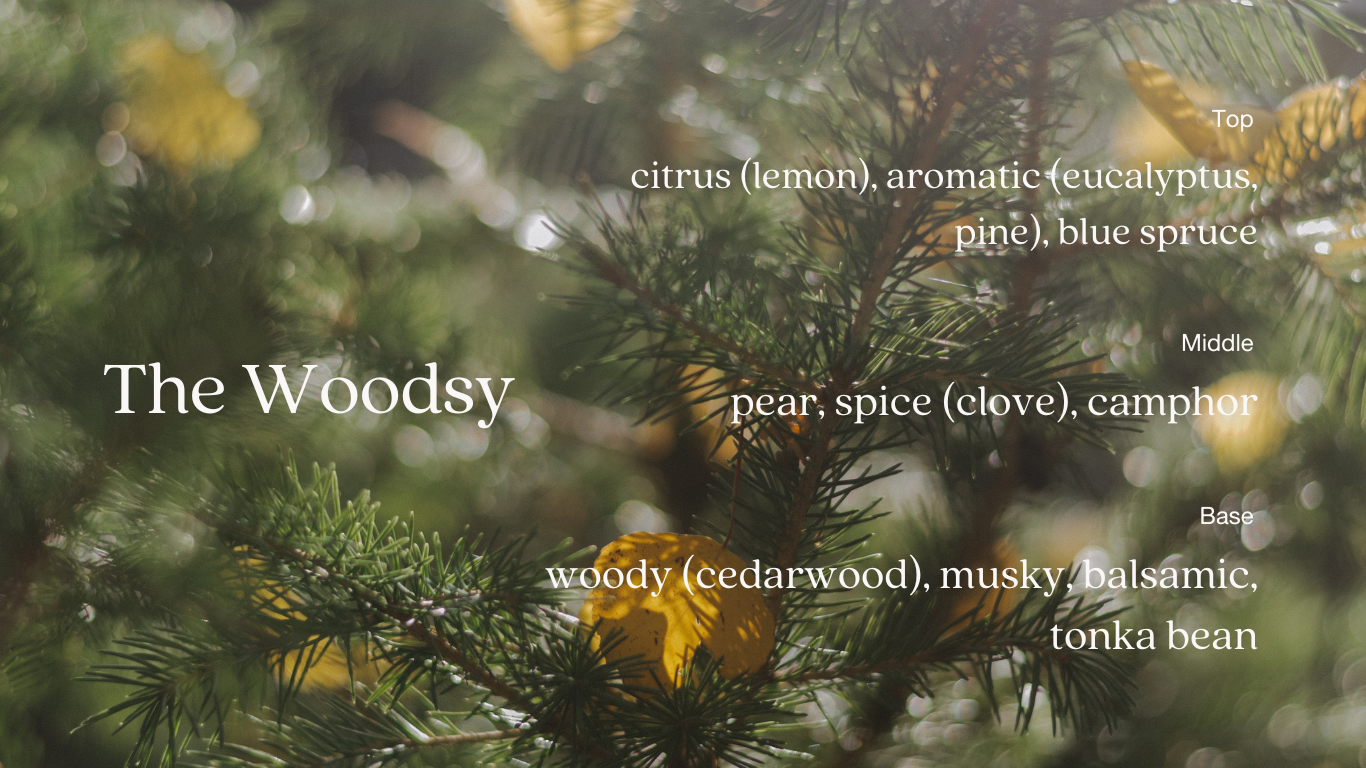 The Woodsy is an uplifting fragrance with top notes of tangy lemon, eucalyptus and smooth, sweet blue spruce. Refreshing pine, comforting clove and juicy pear hold the center while warm woods, earthy moss, musk and balsamic tonka bean make the base of this crisp, charming fragrance.